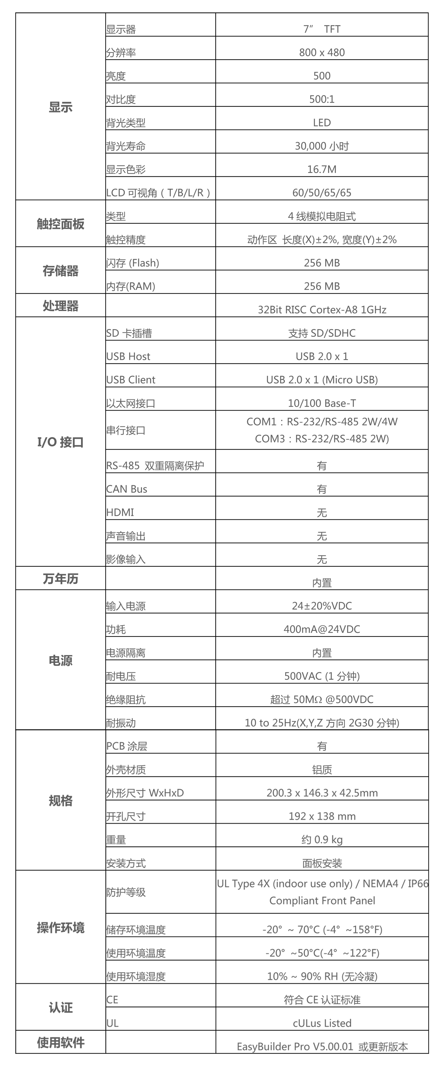鋁合金外殼搭(dā)配全新色(sè)彩與時尚設(shè)計;7' 800x480 TFT LCD;無風扇冷卻(què)係(xì)統(tǒng);內置(zhì)256MB 儲存內存及萬年曆;NEMA4/IP66 麵板防護等級;USB 主接口與USB從接口各一;SD 卡插槽(cáo)支持(chí)SD與SDHC卡;內置電源隔離防護器;Com1 或 Com3 RS485 2W 支持(chí) MPI 187.5K;CAN Bus 裝置支持 CANopen 通訊協議;Com1 / Com3 RS485 及CAN Bus內置電氣(qì)隔離設(shè)計
